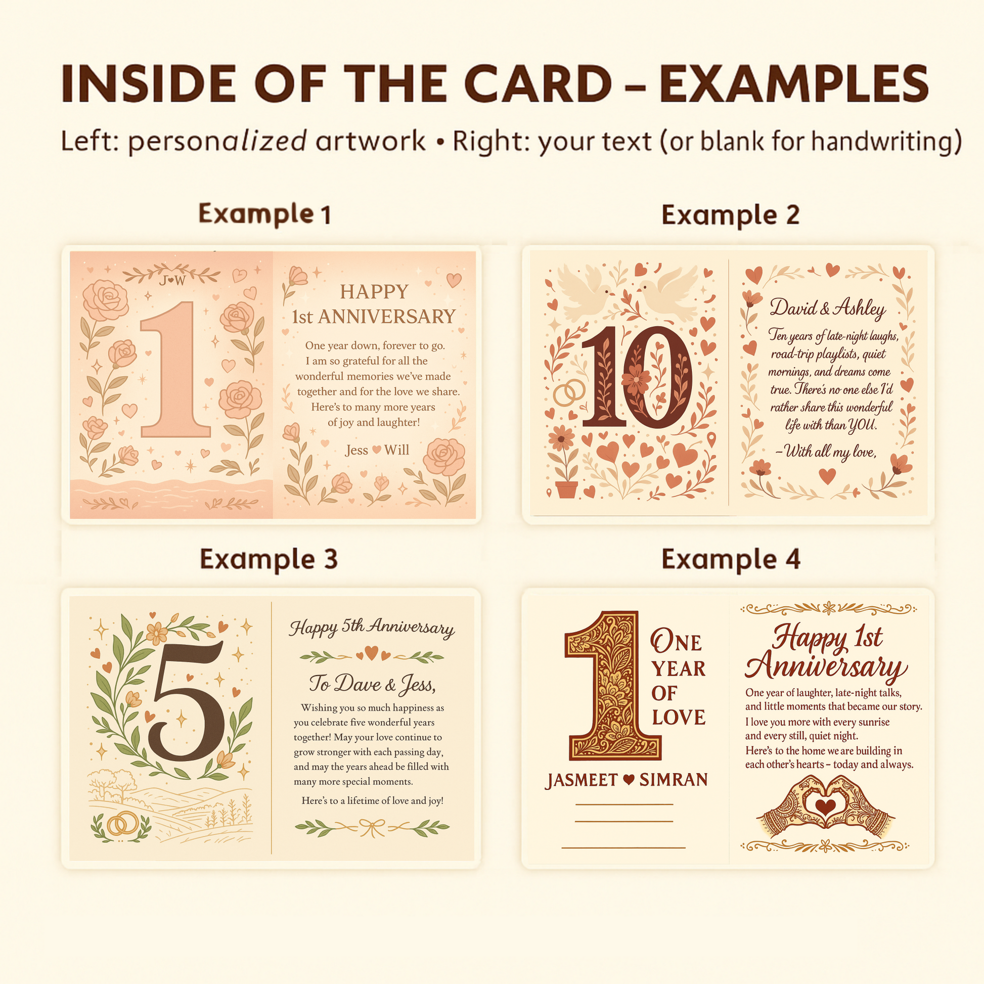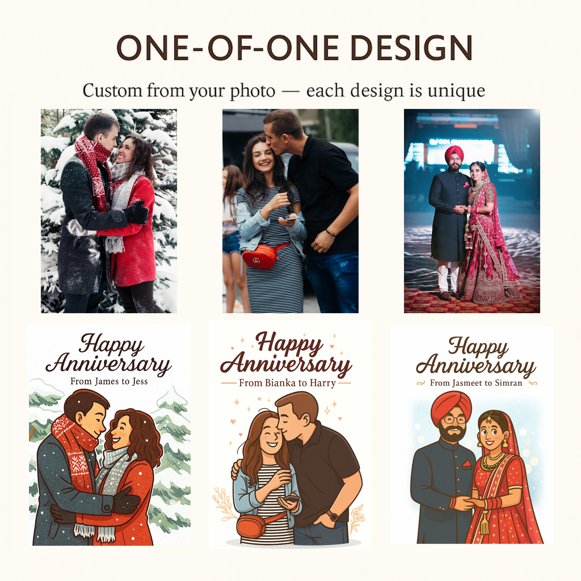 How It Works: Simply upload your favorite photo of you and your partner, provide your personalization details (names, initials, or custom message), and we'll create a one-of-a-kind illustrated anniversary card that you'll both treasure forever.